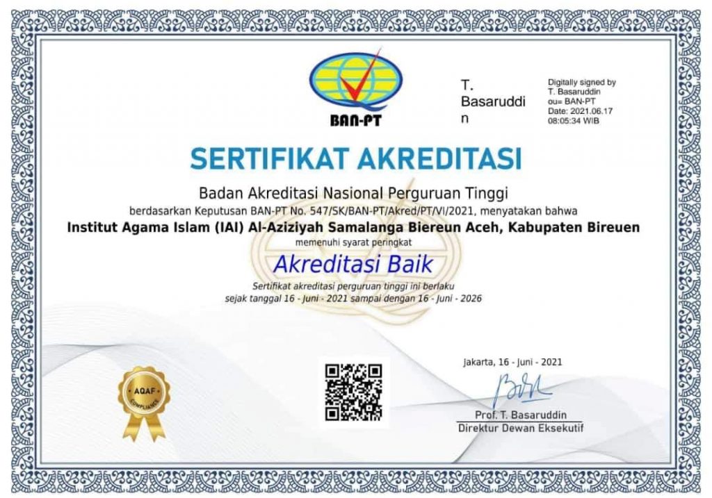 BIREUEN I IAIA- Badan akreditasi nasional Perguruan Tinggi (BAN-PT) melakukan asesmen lapangan (AL) secara daring terhadap IAI Al-Aziziyah Samalanga selama dua hari, Jum’at-Sabtu, (4-5 Juni 2021). Hal ini sebagaimana diungkapkan Humas IAI Al-Aziziyah Samalanga Dr. Tgk. Riandi Syafri, MA dalam asesmen lapangan (AL) daring terhadap institusi IAI Al-Aziziyah Samalanga BAN-PT menugaskan tim asesor yang terdiri […]